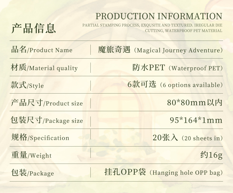 Magical Journey Series PET Stickers 6 Styles 20 Sheets